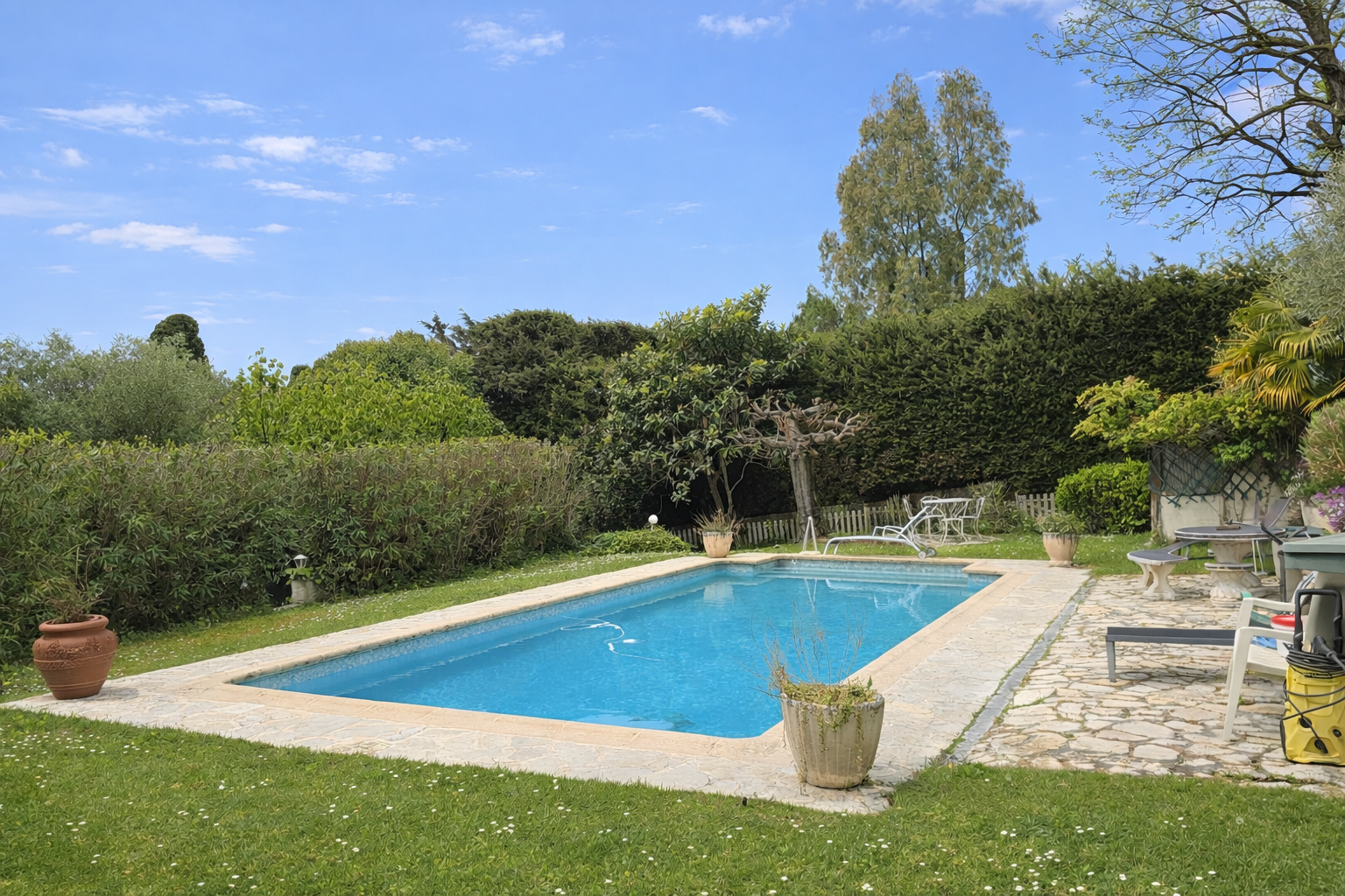 Édifiée sur un terrain arboré de 1 500 m2, la propriété propose de superbes espaces extérieurs : Une Piscine avec pool house, jardin paysager